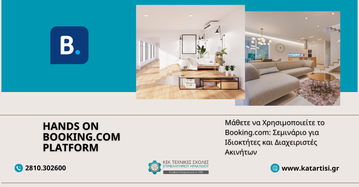 Εκπαιδευτικές ενότητες: 1) Δημιουργία λογαριασμού και σωστό set up παροχών ακινήτου. 2) Συγχρονισμός ημερολογίων και σωστή τιμολόγηση των πωλήσεων. 3) Κατανόηση της λειτουργίας του help center, πληρωμών από Booking.com, πολιτικές ακύρωσης και κέντρου ευκαιριών. |